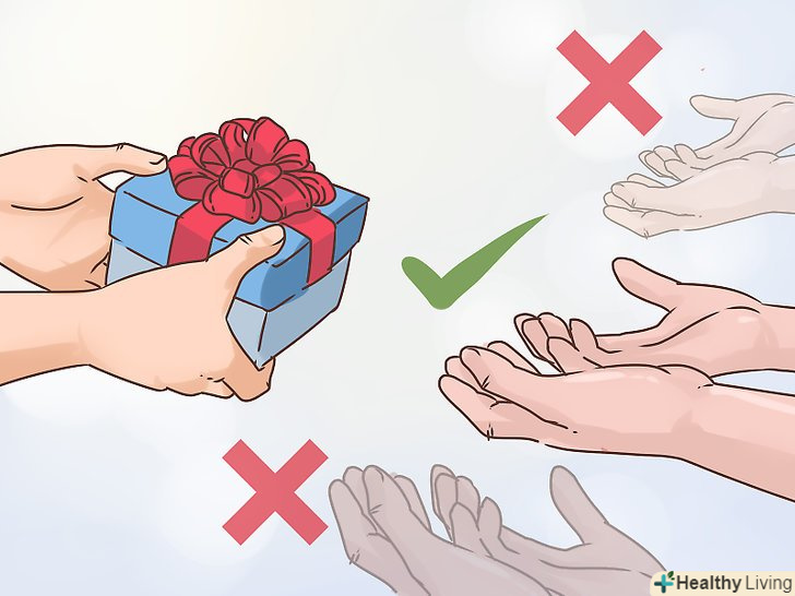 Даруйте подарунки тільки тим людям, хто говорить: "спасибі". Якщо вас турбує те, що ви не отримали подяки, змініть практику дарування подарунків в майбутньому і включіть в своє життя тільки більш вдячних людей. Наприклад, на наступні свята даруєте подарунки тільки тим, хто подякував вам минулого разу. Або не даруйте людині подарунок на день народження в наступному році, якщо він не оцінив ваші старання в цьому році. [4]- Можна встановити власні обмеження, виходячи зі свого рівня комфорту. Наприклад, навряд чи ви зможете перестати дарувати подарунки близькому родичу, навіть якщо він не буде вас дякувати. Замість того, щоб вручати йому розкішний подарунок, виберете менш дорогий варіант, щоб витрачати на цього родича менше грошей і потенційно менше засмучуватися через відсутність подяки з його боку.