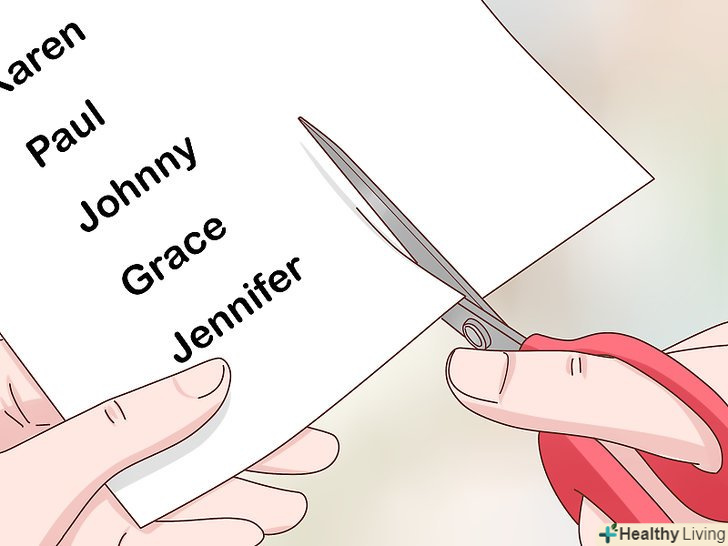 Напишіть ім'я кожного учасника на шматочку паперу. Якщо ваша група досить велика, і люди не дуже добре один одного знають, було б непогано, якби учасники написали не тільки свої імена, але і якісь відмінні риси/інтереси як, наприклад, "чоловік, любитель астрології, 65" або "жінка, триборець-ентузіаст, 34". У більш вузьких колах і при більш близьких відносинах між учасниками, імені людини досить.