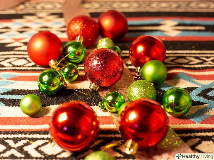 - Кулі та інші базові прикраси, які можна використовувати замість них, бувають різного кольору, з різною поверхнею і малюнком. Виберіть за основу один або два кольори. Наприклад, візьміть червоні і зелені кулі - все матові, всі блискучі, або червоні блискучі, а зелені матові (або навпаки). Срібний і золотий-відмінні кольори для нейтральних прикрас, так як поєднуються практично з чим завгодно. Коли Базова колірна гамма сформована, не бійтеся розбавити її прикрасами інших кольорів.