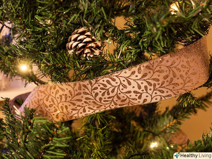 - Якщо ви прикрашаєте ялинку стрічками, Візьміть стрічки з металізованої нитки або з дротом, протягнутою по краю, щоб вони тримали форму, а не провисали. Візьміть стрічки середньої ширини: занадто вузькі будуть погано видно на відстані, а занадто широкі незручно розвішувати. Щоб стрічка виглядала ще нарядно, розподіліть рівномірно по всій її довжині маленькі бантики.