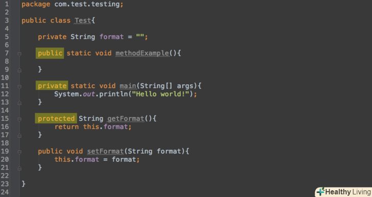 Словоpublicперед назвою методу означає, що метод можна викликати звідки завгодно, включаючи інші класи і навіть файли / пакети, якщо ви імпортуєте відповідний клас.замінитиpublicможна наступними варіантами:protectedіprivate. Якщо методprotected, то тільки цей клас і підкласи (класи, створені на основі класу) можуть викликати даний метод. Якщо методprivate, то він може бути викликаний тільки всередині класу. Останнє ключове слово, в общем-то, навіть не слово. Воно використовується, коли замістьpublic,protectedабоprivateу вас нічого. Це виклик за замовчуванням, що означає, що лише класи в тому ж пакеті можуть звивати цей метод.