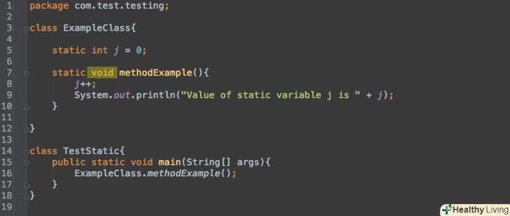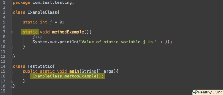 Друге ключове слово,static, означає, що метод належить класу, а не прикладу класу (об'єкту). статичні методи можуть викликати за допомогою імені класу: "ExampleClass.methodExample()". Втім, якщо ключове словоstaticвідсутня там, тоді метод може бути викликаний тільки через об'єкт. Наприклад, якщо класу називаєтьсяExampleObject, і у нього є конструктор (для створення об'єктів), тоді ми може створити новий об'єкт, надрукувавшиExampleObject obj = new ExampleObject ();, і викликати метод так "obj.methodExample();".