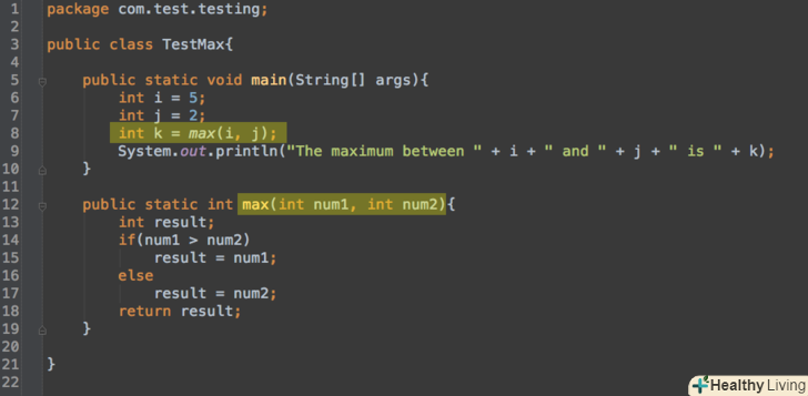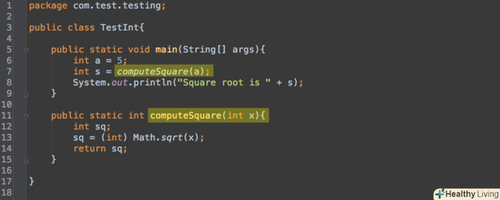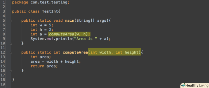 Деякі методи вимагають параметри. Метод, що вимагає параметр цілого числа, виглядає так:someMethod (int a)використовуючи подібний метод, ви напишіть ім'я методу, потім ціле число в дужках:someMethod(5)абоsomeMethod (n)якщоn- ціле число.
