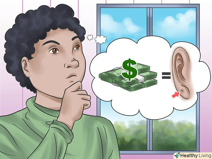 Вартість. Якщо ви хочете проколоти вуха, то слід врахувати дві статті витрат: вартість проколу і вартість ювелірних виробів. Буде потрібно заплатити фахівцеві за прокол вух і матеріали, а також купити сережки. Якщо у вас є сережки, то їх можна принести з собою. Спочатку краще подбати про те, щоб у вас вистачило грошей. [4]- Зазвичай вартість залежить від обраного місця. У простій Перукарні прокол буде коштувати дешевше, ніж в спеціальному салоні, але в салонах використовують професійні інструменти і представлений широкий вибір прикрас. [5]