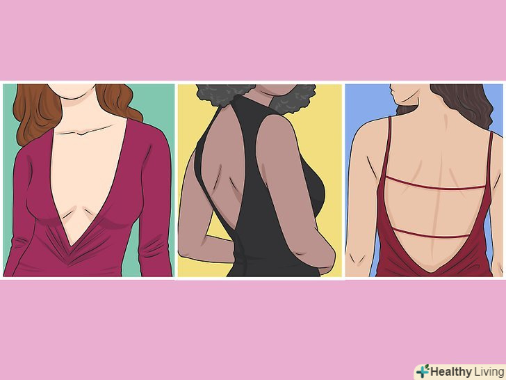 Приміряйте класичні моделі топів і суконь, які зазвичай носять без бюстгальтера. існують деякі моделі топів і суконь, погано поєднуються з бюстгальтером, тому їх розумно носити без нього. Спробуйте приміряти топ з глибоким вирізом на спині або з відкритою спиною, а також сукні та топи на бретелях або зовсім без них. До одягу, яка краще виглядає без бюстгальтера, відносять:- Сукні та топи з глибоким вирізом горловини;