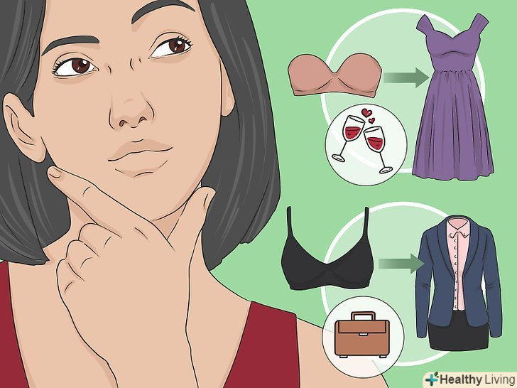 Подумайте про свій гардероб. є речі, які дійсно краще носити без бюстгальтера, оскільки він видно з-під них. Одяг з глибоким вирізом, з великими прорізами на спині, топи і сукні з відкритою спиною — все це краще виглядає без бюстгальтера.- Топи і сукні на тонких бретелях або без бретелей зазвичай носять з бюстгальтером без бретелей.