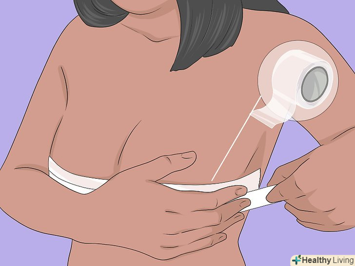 Застосовуйте для підтримки грудей хірургічний пластир. хірургічний пластир дуже добре прилипає до шкіри. Придбати його можна в аптеці. Майте на увазі, що це досить незручний спосіб фіксації грудей, тому краще залишити його на випадок крайньої необхідності. Ось як це робиться: [10]- Нахиліться вперед, щоб груди піднялася.