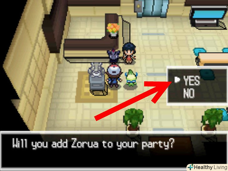 Поговоріть з хлопчиком біля бару.там стоятиме хлопчик і дівчинка, в першій кімнаті після входу. Хлопчик стоїть праворуч. Поговоріть з ним. Якщо у вас є Селебі, хлопчик скаже " Yip yap!"і виявиться, що це Зоруа. Якщо у вас є Селебі, він піде з вами.[3]