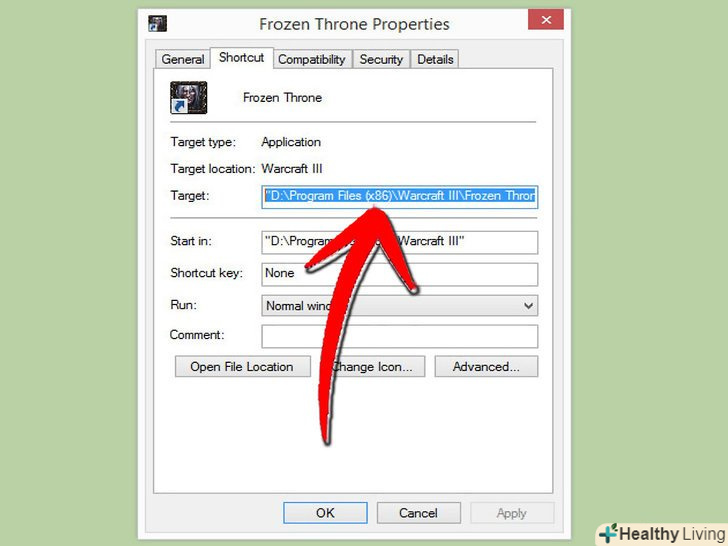 Натисніть правою кнопкою миші по значку Warcraft 3 на робочому столі і натисніть на кнопку «Змінити значок». вгорі вікна буде показаний шлях значка. Він може мати наступний вигляд: C:\Program Files \ Warcraft III \ Frozen.exe. Скопіюйте цей шлях для наступного кроку.