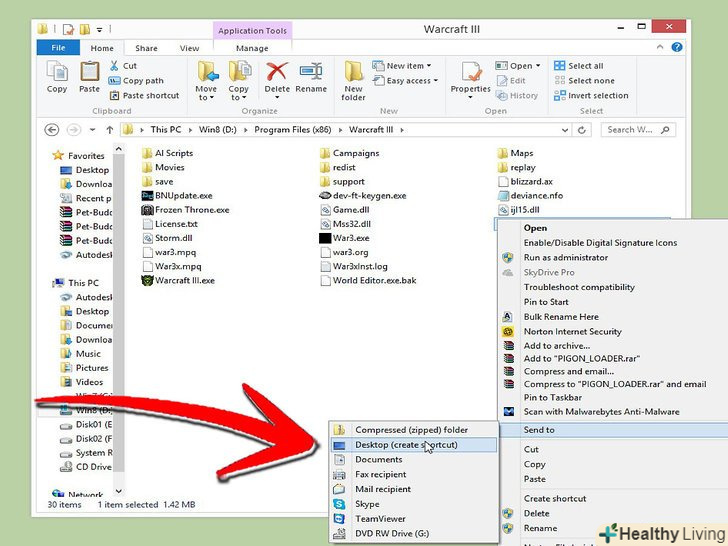Створіть ярлик пропатченого лаунчер. натисніть правою кнопкою миші по файлу PIGON_LOADER.exe в папці з грою. Виберіть "Надіслати «і виберіть» робочий стіл" (Створити ярлик). Натисніть правою кнопкою миші по новому ярлику і натисніть на "властивості". Натисніть на кнопку "Змінити значок". Вставте шлях, який ви скопіювали в минулому кроці.- Ви можете перейменувати ярлик на що завгодно, наприклад, на "Warcraft 3". Ви будете використовувати цей ярлик для запуску гри.