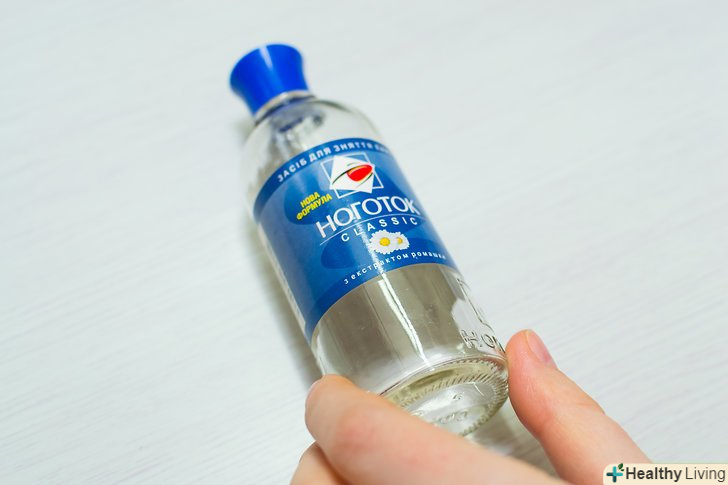 Зніміть лак. для початку видаліть з нігтя будь-яке покриття, щоб можна було оцінити пошкодження і усунути його. Використовуйте відповідну рідину для зняття лаку. Наприклад, якщо у вас на нігтях темний лак або лак з блискітками, буде потрібно рідина на основі ацетону. Змочіть рідиною ватяну кульку, диск або ганчірочку і зітріть лак в напрямку тріщини, щоб та не збільшилася. [17] [18] [19]- Не рекомендується використовувати рідину на основі ацетону, оскільки він висушує нігті і робить їх більш ламкими. Такою рідиною не можна змивати лак з акрилових нігтів та інших штучних покриттів.