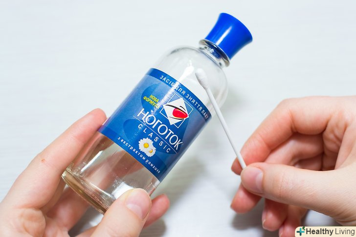 Зніміть лак для нігтів. Якщо на нігті є лак, спочатку потрібно змити його. Змочіть ватний диск або м'яку ганчірку рідиною для зняття лаку (якщо лак темний або з блискітками, краще використовувати рідину на основі ацетону) і акуратно протріть поверхню нігтя. Тріть уздовж тріщини, щоб ніготь не розірвався ще більше.