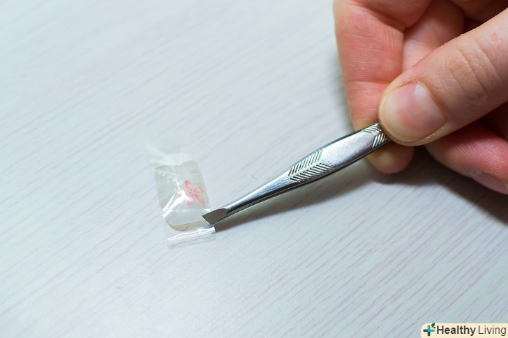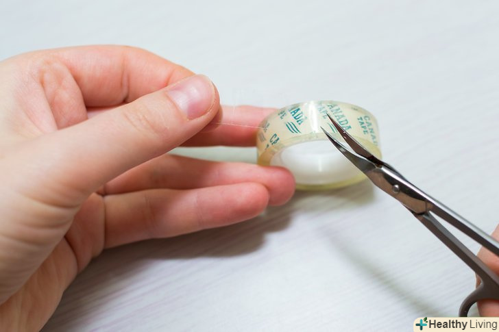Накладіть скотч на ніготь. прикладіть скотч до нігтьової пластини пальцями або пінцетом. Подушечкою пальця притисніть скотч до нігтя і розгладьте його, щоб позбутися від бульбашок і складок. [21]
