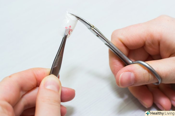 Відріжте невеликий шматочок скотча і надайте йому форму нігтя. використовуйте манікюрні або маленькі швейні ножиці. При цьому можна притримувати скотч щипцями. Швидше за все, ідеальної форми Вам домогтися не вдасться: просто постарайтеся вирізати такий шматочок, який буде трохи менше нігтьової пластини і не буде зачіпати кутикулу і шкіру по краях нігтя. Зробіть смужку скотча трохи довше, щоб вона виступала за край нігтя. [20]
