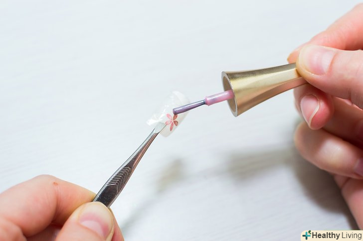 - Заклейте розрив. нанесіть одну краплю клею для нігтів поверх місця розриву, а другу — під ним. Ні в якому разі не використовуйте супер-клей, який не призначений для живих тканин. Зубочисткою або паличкою для видалення кутикули розподіліть клей по тріщині. Притисніть паличку до нігтя і потримайте 30-40 секунд, поки клей не схопиться. Однак не притискайте паличку занадто довго, інакше вона може пристати до клею. Клей повністю висохне приблизно за дві хвилини. [7]