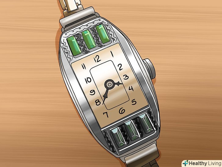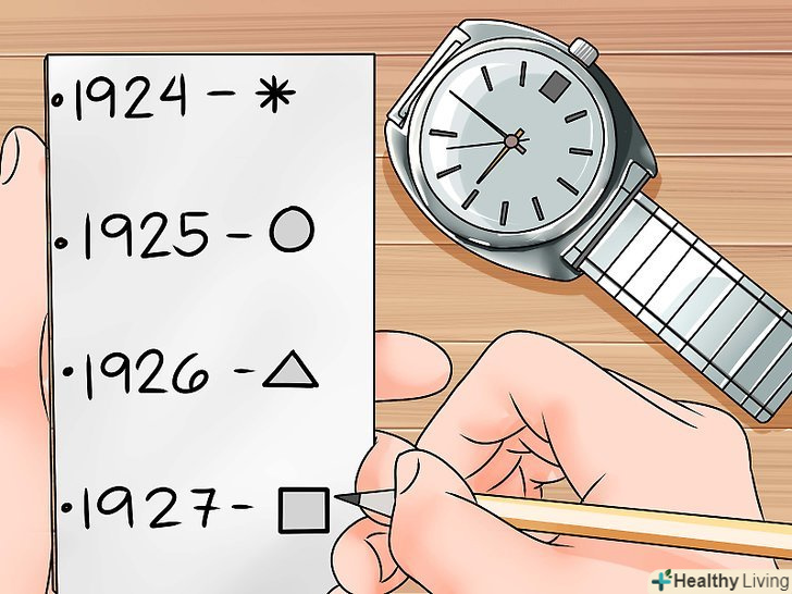 Для годин, вироблених до 1950, знайдіть дату, відповідну символу. Якщо на задній кришці годинника немає буквено-цифрового коду, швидше за все, годинник випущений раніше, ніж в 1950. Вам потрібно перевірити внутрішній механізм годинника і знайти картинку-символ дати, щоб встановити рік виробництва.- Зверніть увагу, для деяких років символи збігаються. Якщо ви сумніваєтеся, Перевірте не тільки символ дати, але і стиль годинника, щоб встановити, який епосі годинник відповідають більше.