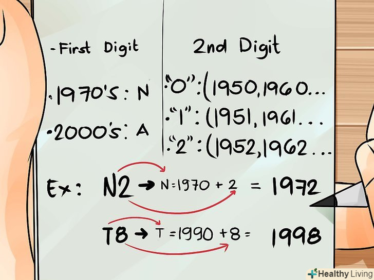 Переведіть код для годин, виготовлених після 1950. для годинника Bulova, виготовлених в 1950 і пізніше, виробники використовували систему двозначних буквено-цифрових кодів. Ці коди зазвичай знаходяться на задній кришці, але іноді вони розташовані на внутрішньому механізмі поруч з установочним гвинтом.- Перший знак коду відповідає десятиріччю. Другий знак відповідає конкретному року.