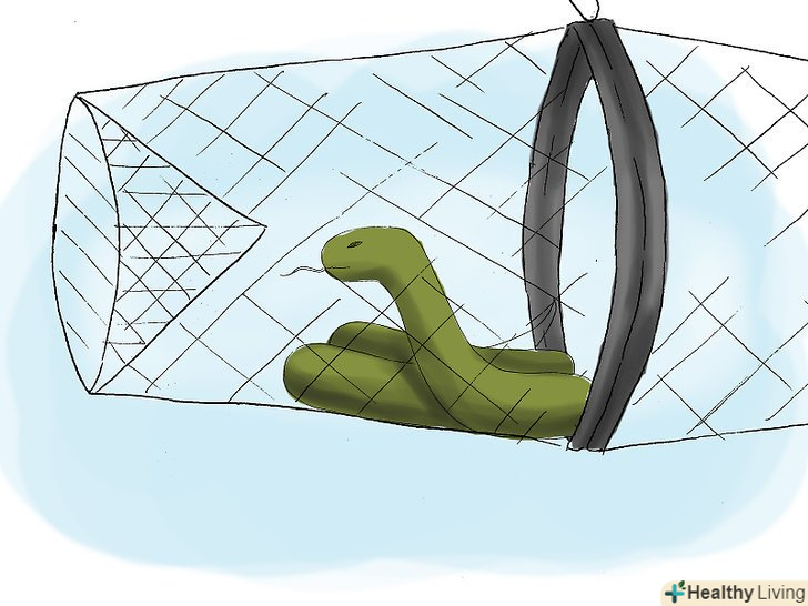 Спробуйте ловлю сіткою. це хороший альтернативний варіант, якщо ви часто стикаєтеся зі зміями і не хочете купувати нові клейові вставки для клеїться пастки. Пастки-сітки виготовлені з дроту, циліндричної форми з отворами в обох кінцях, які перекидаються всередину пастки. Просто помістіть кілька яєць всередину в якості приманки. Змія буде лізти в один з отворів за яйцями, але вже не зможе знайти свій вихід.- Пастки-сітки досить недорогі і їх легко знайти. Шукайте їх в магазині садово-городніх приладдя.
