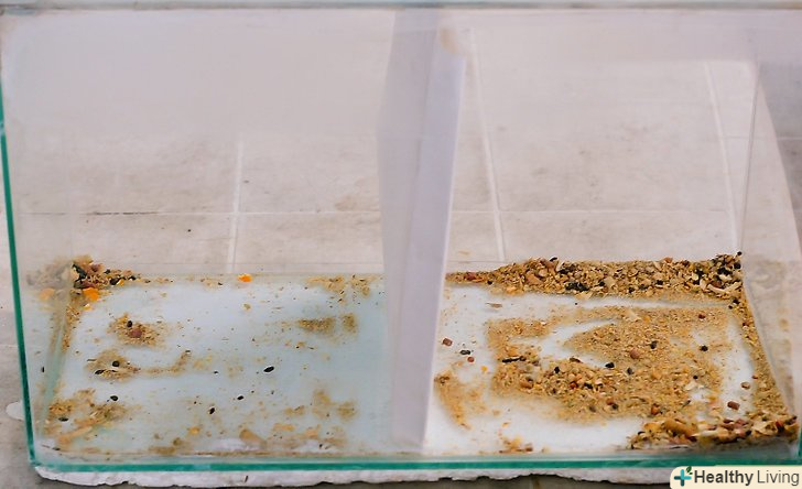 Покладіть новий аркуш паперу в клітку і насипте тирсу. поставте шматок картону, щоб розділити клітку на 2 частини.