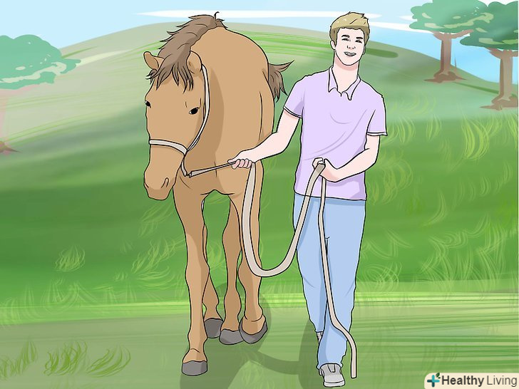 Водите коня. водіння коня — ще один хороший спосіб затвердження в якості лідера для неї. Таке тренування навчить коня поважати ваш особистий простір і буде сприяти розвитку у неї довіри до вас, а також зміцненню взаємин з вами. [30]- Водіння коня поруч з собою (з партнерської позиції) вважається найбезпечнішим і кращим методом. Можна розташовуватися поруч з будь-яким плечем Коня, але зазвичай прийнято водити коня, перебуваючи у її лівого плеча. [31]