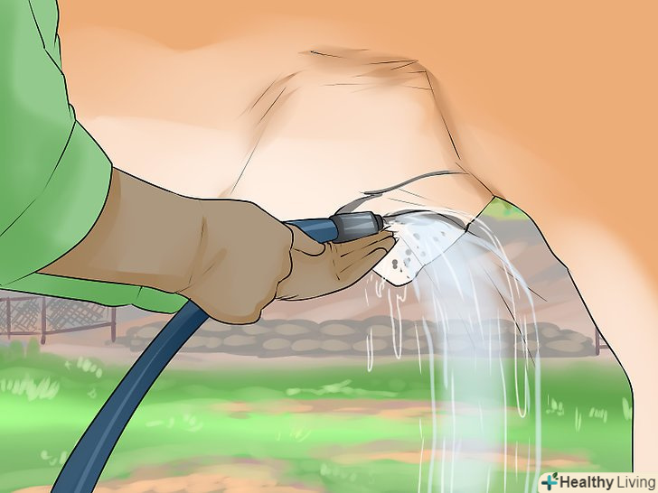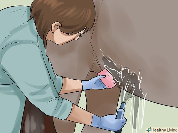 Змийте бруд з крайньої плоті. Візьміть м'яку губку або ватний тампон і акуратно протріть уздовж зовнішнього краю крайньої плоті коня. Видаліть всю смегму, бруд та інші сторонні речовини, які можуть там накопичитися. Протріть і промийте водою кімнатної температури. Не тріть занадто агресивно. Роблячи губкою або ватним тампоном кругові рухи, просувайтеся уздовж крайньої плоті. [11]