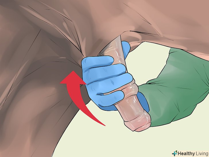 Однією рукою акуратно відсуньте крайню плоть назад. відсуньте її якнайдалі, перш ніж вставляти руку. У кращому випадку, крайню плоть вдасться відсунути назад на 2,5-5 см.це дозволить зменшити кишеню, який утворюється навколо пеніса і полегшить очищення. Не кожен кінь дозволить вам зробити це. Якщо ви будете робити це досить часто, то Кінь звикне до відчуттів і не буде чинити опір. [12]