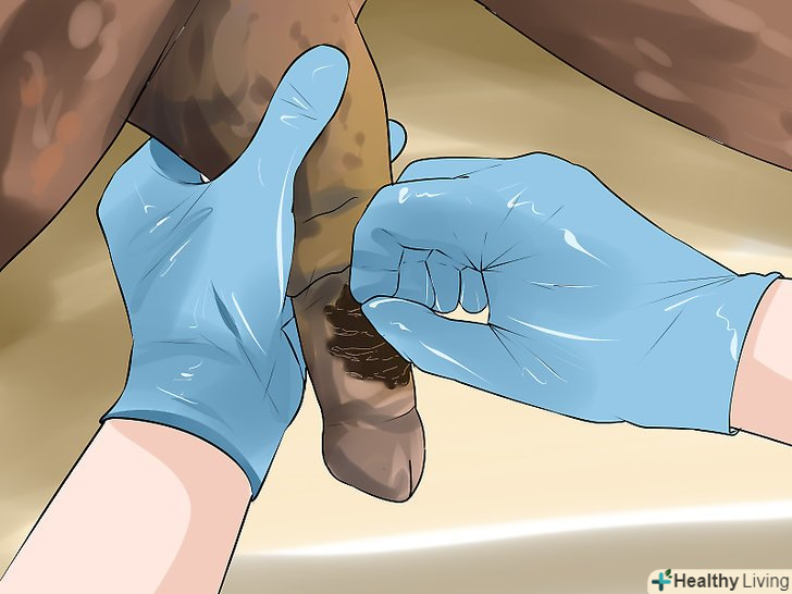 Іншою рукою видаліть смегму навколо пеніса. швидше за все, вона буде кольору іржі. Це нормально. Смегма (засохлі виділення) зазвичай розшаровується і розсипається в руці. Витягніть її якомога більше, а потім промийте великою кількістю теплої води. [13]