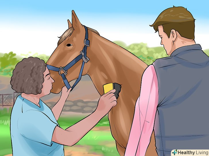 Попросіть когось допомогти вам тримати коня. помічник може утримувати коня за поводи, направляючи його в потрібну сторону. Він також може чистити коня щіткою, щоб заспокоїти його, поки ви займаєтеся брудною роботою. Якщо у вас немає помічника, то міцно і надійно прив'яжіть коня.