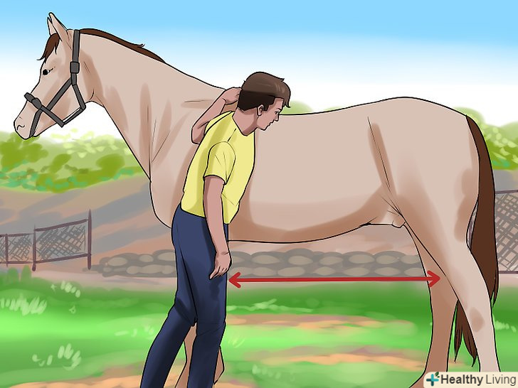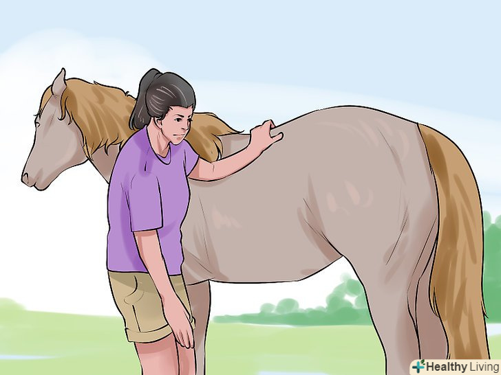 Вільною рукою ніжно погладжуйте коня по спині. це допоможе вам відчувати всі рухи коня - ви зможете швидко відскочити в сторону, якщо він рушить, щоб лягнути. Багато власників коней і ветеринари стверджують, що якщо Кінь вам довіряє, то рука допоможе йому заспокоїтися. [6]