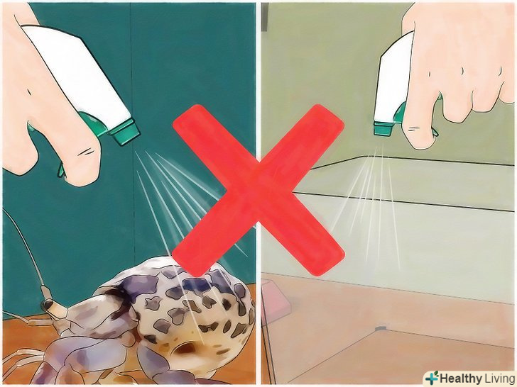 Не обприскуйте акваріум і рака спреєм від кліщів. звичайний спрей від кліщів не призначений для Раків-відлюдників і може завдати їм шкоди. Не слід використовувати подібний спрей для раків або акваріума. [11]- Не слід також використовувати для очищення раку або акваріума відбілюючий розчин. У відбілювачі міститься велика кількість хлору, який може привести до опіку зябер і хвороби раку-відлюдника.