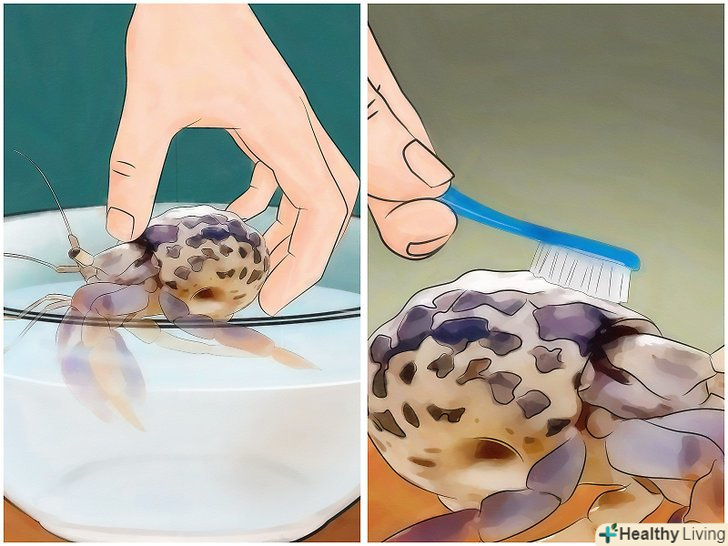 Перемістіть рака-відлюдника в іншу ємність. щоб як слід почистити акваріум і знаходяться в ньому предмети, перш за все необхідно перемістити його мешканця в іншу ємність. В якості такої ємності можна використовувати чистий пластмасовий таз або відро. Поки ви будете чистити акваріум, рак-відлюдник, ймовірно, спробує дослідити нове місце. [2]- Можна також набрати дехлорированную воду в невелику миску і поставити її поруч з ємністю з раком, щоб вода нагрілася до кімнатної температури. Цю воду можна буде використовувати пізніше для видалення кліщів з самого раку-відлюдника, перш ніж пересадити його назад в чистий Акваріум. [3]
