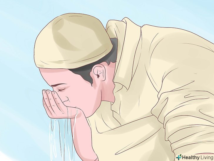 Вимийте обличчя. тричі Вимийте обличчя, провівши руками від правого вуха до лівого, а також від лінії росту волосся до підборіддя.