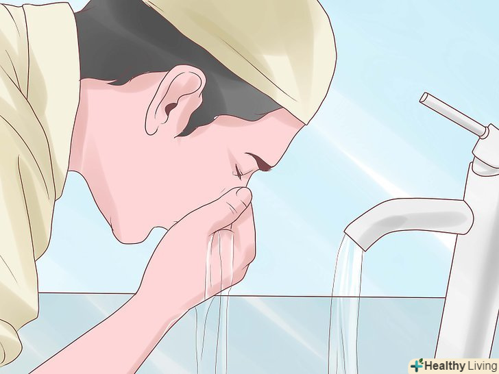 Наберіть в рот води. використовуйте праву руку, щоб тричі набрати в рот воду. Обполосніть водою щоки і задню стінку горла. Робіть це ретельно, щоб витягти всі залишилися частинки їжі.