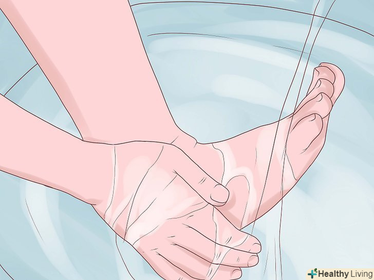 Вимийте кожну ногу. вимийте ноги від ступень до щиколоток і переконайтеся, що вода проходить між пальцями. Використовуйте мізинець, щоб промити між кожним пальцем і усунути всі забруднення. Почніть з правої ноги і ретельно помийте кожну ногу тричі.