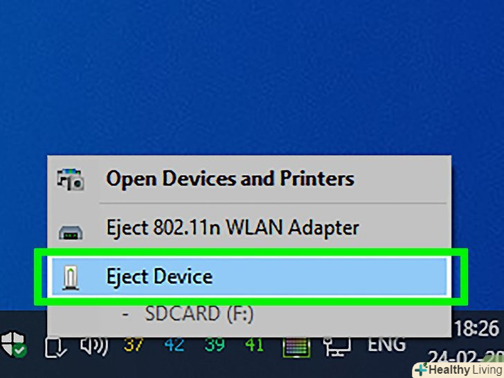 Вийміть SD-карту.клацніть по значку у вигляді флеш-накопичувача в правому нижньому кутку екрану, а потім в меню виберіть»витягти". Коли ви отримаєте повідомлення, витягніть SD-карту з комп'ютера.- Можливо, спочатку вам доведеться натиснути " ^ " в правому нижньому кутку екрану, щоб відобразити значок у вигляді флеш-накопичувача.