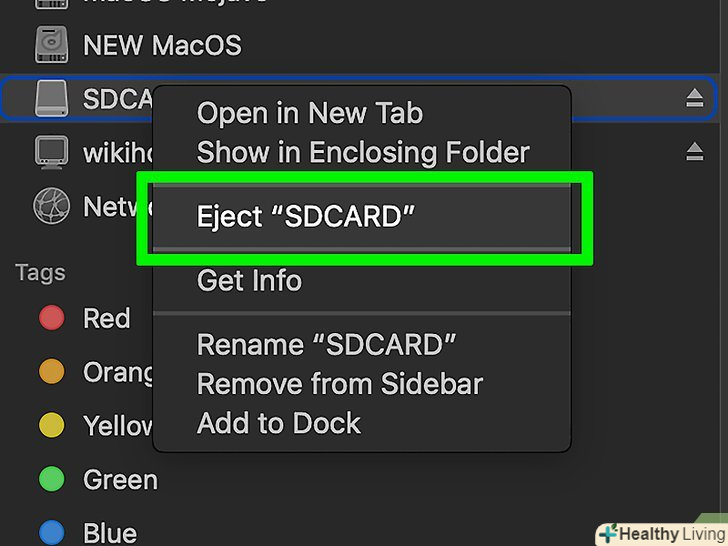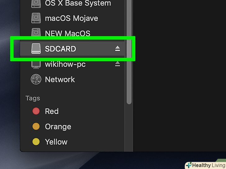 Вийміть SD-карту. натисніть на значок у вигляді трикутника праворуч від імені SD-карти у вікні Finder. Коли ви отримаєте сповіщення, вийміть SD-карту з комп'ютера.