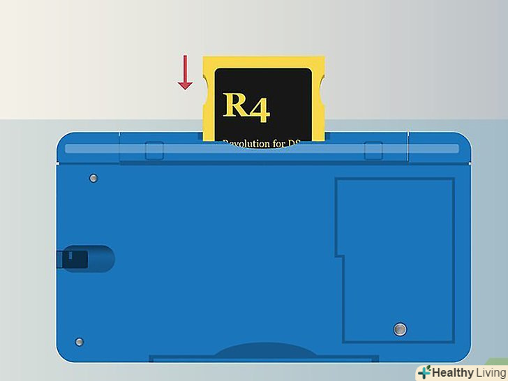 Вставте карту R4 в Nintendo DS.Вставте карту R4 в слот, в який ви зазвичай вставляєте ігрові карти.- Переконайтеся, що карта microSD щільно вставлена в карту R4.