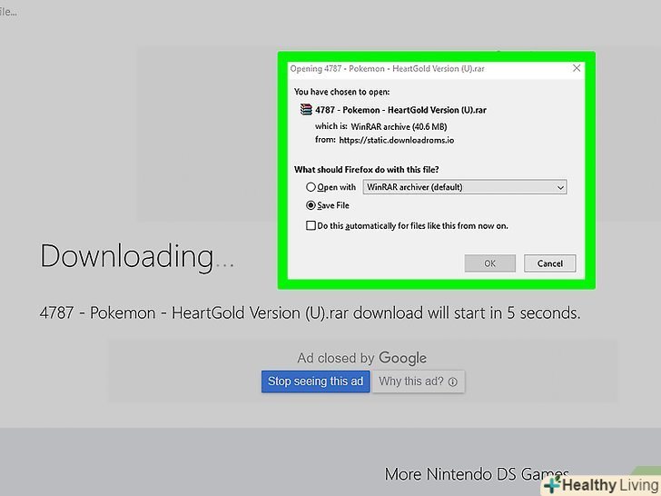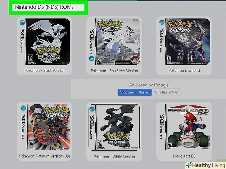 Скачайте ROM-файл потрібної гри.у такому файлі міститься вся гра; скопіюйте кілька ROM-файлів на microSD-карту, щоб вставити її в консоль і запускати гри безпосередньо з карти. Щоб завантажити ROM-файл, в пошуковому рядку введіть назву гри, потім введіть " ds rom "(без лапок), в результатах пошуку виберіть надійний сайт і натисніть «Download» (Завантажити) або аналогічну кнопку.- Майте на увазі, що завантаження ROM-файлів ігор, які ви не купували, є незаконним у більшості країн.
