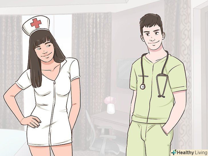 Приміряйте костюми. костюми допоможуть краще вжитися в свою роль і зробити гру більш живою і реалістичною. Залежно від типу рольової гри, яку ви вибрали, костюми можуть варіюватися від сексуальної нижньої білизни до одягу лікаря або медсестри. [7]- Найкраще почати з простих костюмів. Наприклад, можна просто надіти перуку або поекспериментувати з макіяжем.