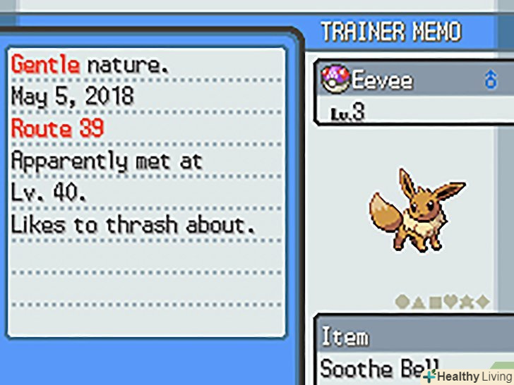 - Щоб краще зрозуміти, наскільки Іві щаслива, поговоріть з жінкою в Голденрод Сіті. Цю жінку можна знайти на північ від магазину велосипедів (Bike Shop) в південній частині міста.[3] якщо вона скаже: "вона виглядає дуже щасливою! Повинно бути, вона любить тебе дуже сильно!» (It looks really happy! It must love you a lot!), то Іві готова підвищити свій рівень і еволюціонувати.