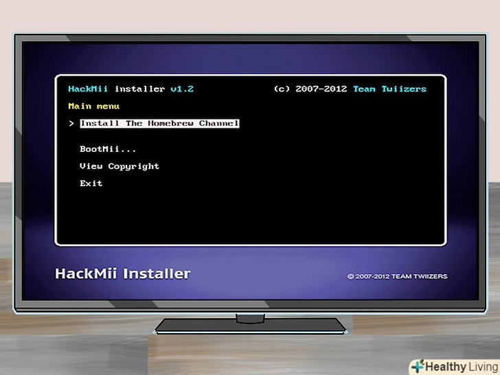 ВиберітьInstall the Homebrew Channel (встановити канал Homebrew) і натисніть A. Ця опція знаходиться вгорі сторінки. Почнеться процес установки Homebrew на Wii.- Щоб вибрати цю опцію, скористайтеся D-Pad, так як на даному етапі сенсорна панель працювати не буде.