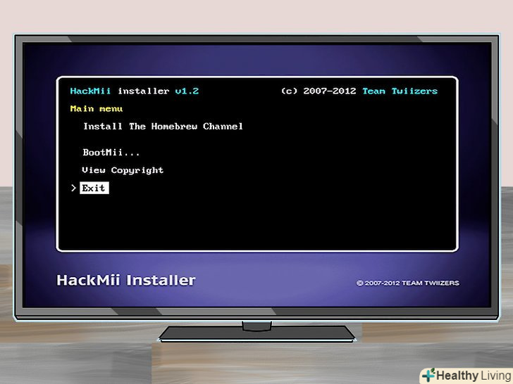 ВиберітьExit (вихід) і натисніть A.ця опція знаходиться внизу сторінки. Wii перезавантажиться, після чого ви перейдете на канал Homebrew.- Щоб повернутися на головний екран Wii, натисніть кнопкуHOME, виберіть «Exit to System Menu» (вийти в системне меню) і натисніть A.