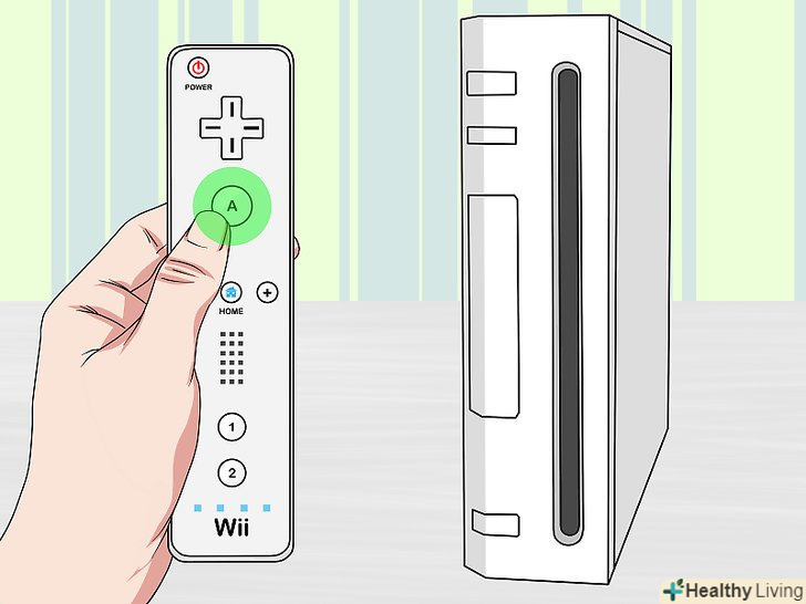 - Увімкніть Wii.для цього натисніть на кнопку живлення вгорі лицьової панелі консолі або натисніть кнопку живлення на пульті Wii.