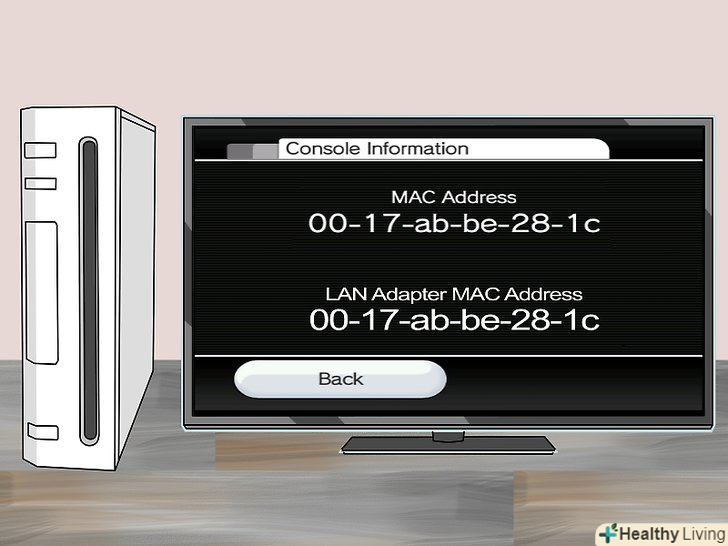 Запишіть MAC-адресу Wii. він відобразиться на екрані і складається з дванадцяти цифр і букв. Ця адреса потрібна для того, щоб завантажити letterbomb і установник HackMii.- Вимкніть Wii.для цього утримуйте кнопку живлення, поки її індикатор не стане червоним.