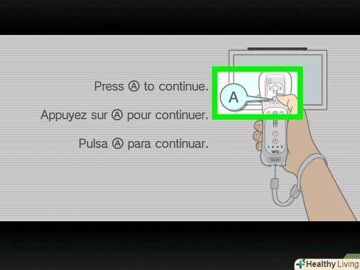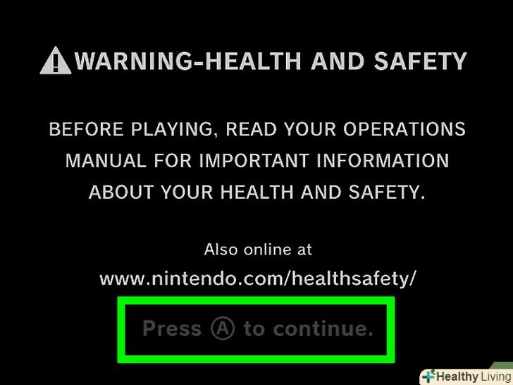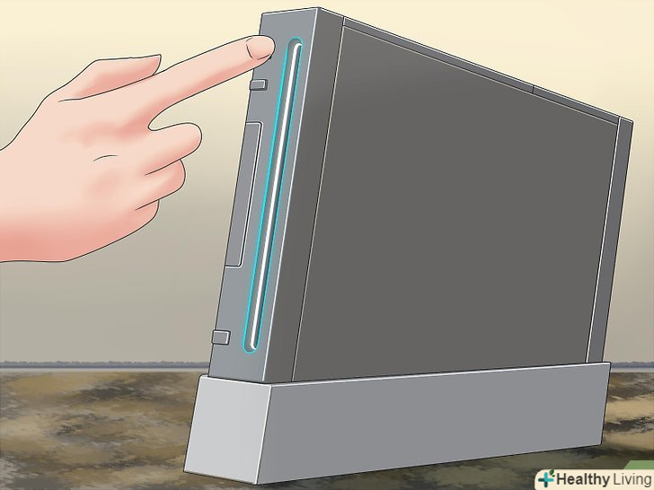 Увімкніть Wii.натисніть кнопку живлення на передній панелі Wii. Через кілька секунд картинка з Wii відобразиться на екрані телевізора.- Якщо картинки Немає, переконайтеся, що телевізор налаштований на сигнал з консолі або перевірте, чи правильно підключений спеціальний RCA-кабель.