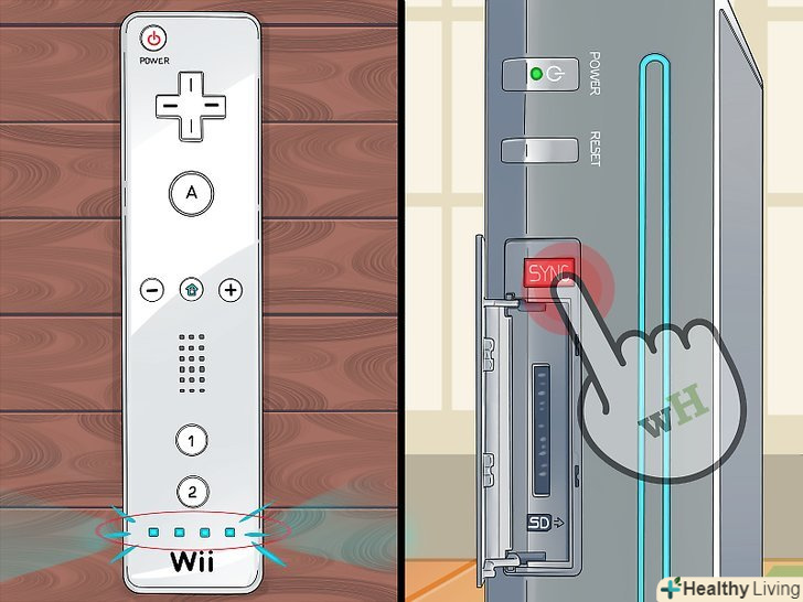 Синхронізуйте контролер з консоллю.коли це станеться, в нижній частині контролера загориться червоний індикатор. Щоб синхронізувати контролер і консоль:[2]- Відкрийте слот для SD-карти на передній панелі консолі.