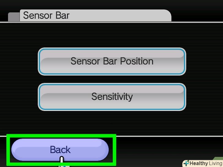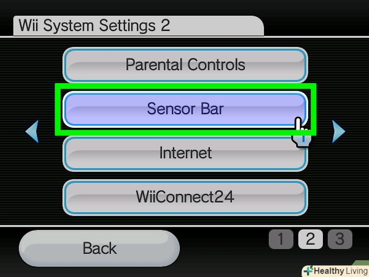 Прокрутіть вправо, виберітьSensor Bar (сенсорна планка) і натисніть A. коли ви прокрутите вправо, ви перейдете на другу сторінку налаштувань Wii, а опція "Sensor Bar" відкриє Налаштування сенсорної планки.