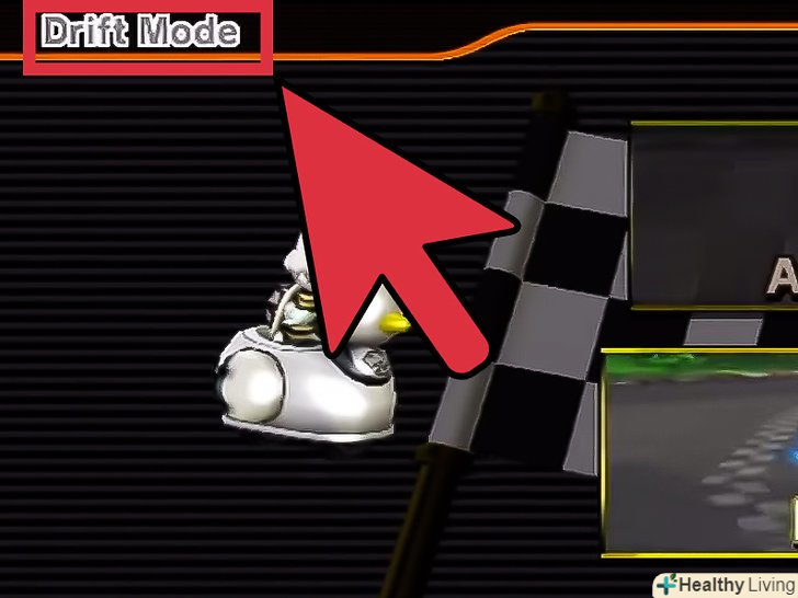 Виберіть тип дрифтингу (заносу), який ви будете використовувати — автоматичний або ручний (Automatic або Manual). Автоматичний дозволяє дрифтити (легше обходити кути) автоматично, без натискання кнопок, але не дозволяє використовувати Mini-Turbo, тобто короткочасне збільшення швидкості. Ручний дрифтинг дозволяє використовувати турбо режим Mini-Turbo, який активується кнопкою B (дрифт), коли на екрані з'являються блакитні або помаранчеві іскри з-під задніх коліс вашого байка або автомобіля. Якщо ви почнете трясти свій пульт Wii з боку в бік, тримаючи кнопку B при повороті, тоді режим турбо буде швидше заряджатися. Автоматичний дрифтинг ідеальний для новачків, вам не доведеться весь час тиснути на кнопку B при поворотах, а ручний режим дозволяє користуватися режимом турбо для значного збільшення швидкості на деякий час, так що подумайте, який режим ви хочете вибрати. Байки і машини заносить по-різному. Подивіться, що вам більше підійде.