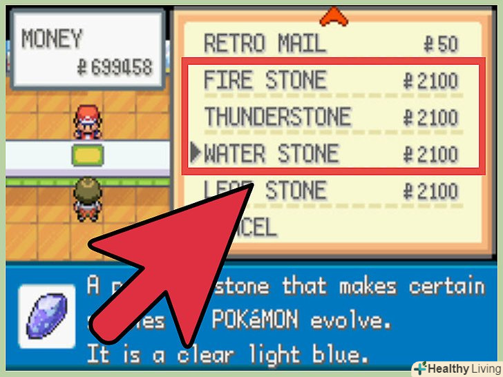 Знайдіть необхідний камінь.розташування та метод отримання каменів залежить від того, в яку версію гри ви граєте. Найлегше їх знайти в початкових іграх про покемонів, так як вам буде потрібно лише купити їх.- Pokémon Red, Blue і Yellow – камені можна купити в магазині міста Селадон.