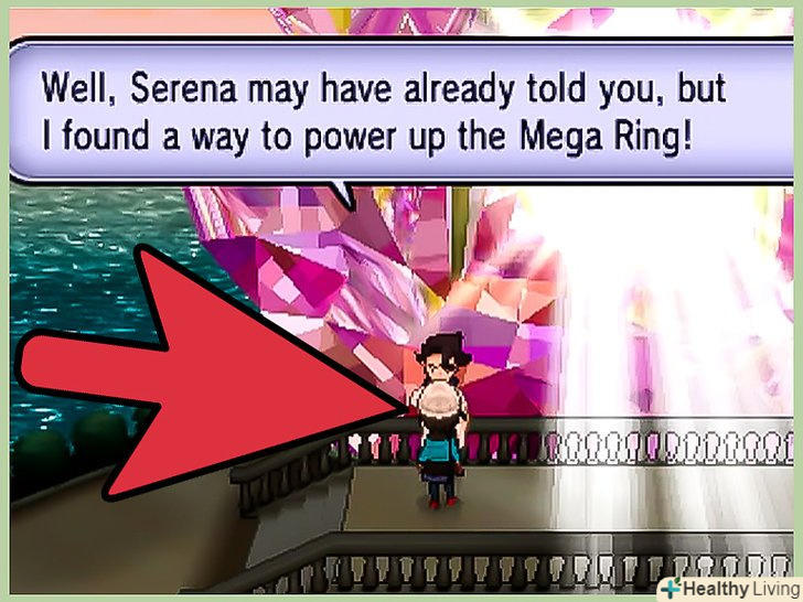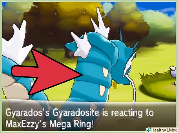 Дістаньте і поліпшите Мега кільце (версії X і Y).щоб еволюціонувати Гярадоса в Мега Гярадоса, вам спершу доведеться дістати Мега камінь, який знаходиться в Мега кільці. Щоб дістати Мега кільце, вам доведеться здолати свого конкурента і отримати Rumble Badge (Значок гуркоту) в залі міста Шалур. Віднесіть значок на верхній поверх вежі майстерності, після чого ви отримаєте Мага кільце.[1]- Після того, як Ви отримаєте Мега кільце, вам потрібно буде поліпшити його, знову здолавши свого конкурента в місті Кілуд. Після битви професор Сикомор поліпшить ваше кільце.